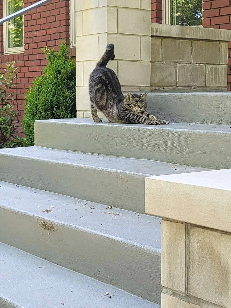 As stated above, TC was a feral kitty not too long ago. One day she decided to hang out at her pet parents’ home and the rest is history! They fell in love with this adorable kitty and now she permanently lives with them. She still mostly lives outside, but except for exploring the nearby woods, she tends to stick close to home. She will also come inside the house at different times of the day; usually when Tim is home. TC gets a 1 Hour to 2 Hour Home Visit several times a week and our Captain Flosse crew love spending time with her! We get to give her lots of pets and she always looks forward to a fresh bowl of wet food and dry food. Her favorite spot to eat and sleep is the front porch. It's a cozy area and right below on the front steps, she enjoys soaking in lots of sunshine in the afternoons!