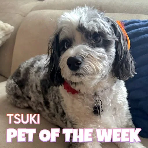 Put your paws together for our pet of the week, Tsuki! This nearly 6 year old Aussie doodle is sporting lovely grey, black, and white mottled and spottled together on her soft and curly coat. She is loved by everybody that meets her! She comes running to meet us, sometimes with a toy in her mouth. Scroll down for everything about Tsuki!!
